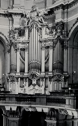 Kontraktabschluß mit Silbermann am 27. 7. 1750. Die Kosten sollen sich auf 20000 Taler belaufen. Am 10. 8. 1750 schließt Silbermann einen Vertrag mit Zacharias Hildebrandt über dessen Mitarbeit am Orgelbau ab. Am 4. 8. 1753 stirbt Silbermann wärend der Arbeit. Sein Neffe Johann Daniel Silbermann übernimmt die Arbeit. Ende 1754 wird das Gehäuse gefaßt und vergoldet. Einweihung am 2. 2. 1755. In der Folgezeit übernehmen Daniel Silbermann, Tobias Schramm, Gottfried Hildebrandt, Friedrich Treubluth, Carl August Venzky Johann Andreas Uthe, Johann Gotthold Jehmlich und Carl Eduard Jehmlich die Pflege der Orgel. 1883 wuurde das Werk auf a1=425Hz gestimmt. 1938? Höherstimmung auf etwa 440 Hz und Erweiterung des Pedals bis f1 durch Emil und Bruno Jehmlich. Von Juni bis November 1944 Ausbau der Windladen, des Pfeifenwerkes, des gesamten Registerwerkes sowie zum Teil der Windkanäle und Auslagerung im Kloster Marienstern durch Gebrüder Jehmlich, auf Anregung von Probst Beier. Am 13/14. Februar wird das Gehäuse und die Bälge durch Luftangriff zertstört. 1964 überführen die Gebrüder Jehmlich das Orgelwerk in die eigene Werkstatt. 1967 Beginn der Aufbauarbeiten. Den Prospekt stellen Tischlermeister Max und Joachim Engelstädter an Hand von Aufmaßzeichnungen und Skizzen und des Schnitzwerkes durch die Bildhauer Walter Thürmer und Rosi Schwabe. Der Prospekt wurde nach Fotos rekonstruiert. Überholung der Windladen, Traktur, Registratur und des Pfeifenwerkes. Der Pedalumfang wird auf Wunsch der Organisten um cis1 und d1 erweitert. Da bei den Höherstimmungen seit 1883/84 die Pfeifen vor allem in hoher Tonlage gekürzt worden sind, wird von der zeitraubenden und kostspieligen Wiederherstellung des originalen Stimmtones abgesehen. Das Pfeifenwerk wird gegen Widerspruch der meisten Sachverständigen gleichschwebend eingestimmt. 1971 ist die Einweihung der Orgel. |