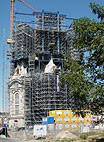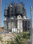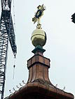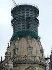 Die letzten Außenarbeiten sind bald fertig. Unten wird bereits vor der Kirche die Dachhaube montiert, welche im Juli aufgesetzt wird. Das Gerüst oben wird bald der Vergangenheit angehören. |